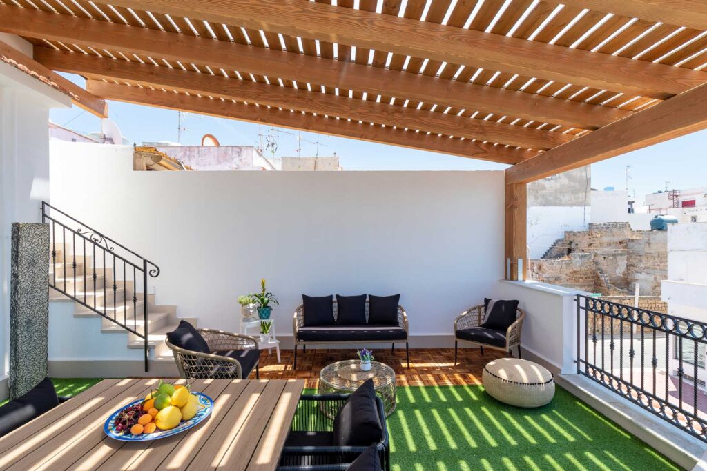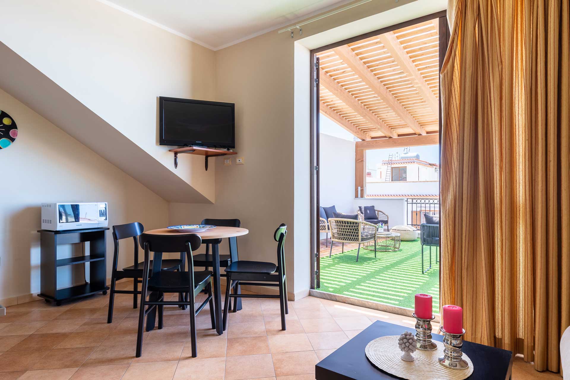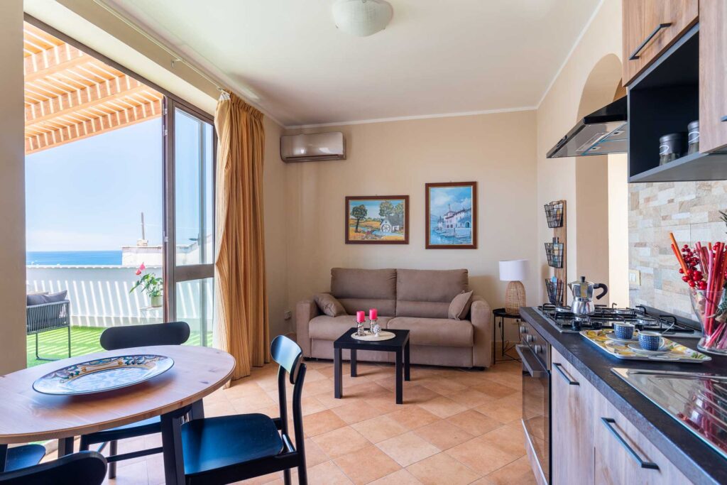 Qui si dorme bene tra guanciali sempre nuovi, la terrazza sul mare è un plus irrinunciabile, aperitivo al tramonto e cena vista mare, la copertura tiene fresco anche di giorno.