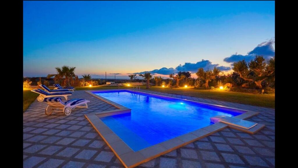 Enchanting villa near Trapani, nestled in a lush Mediterranean garden of palm trees, citrus trees, and fragrant Mediterranean scrub, with a splendid private pool ideal for relaxing. Conveniently located, it offers easy access to the Trapani and Paceco Salt Pans Nature Reserve, Erice with its cable car, the Zingaro Nature Reserve, San Vito Lo Capo, Segesta, and Trapani. Perfect for families and groups of friends, it offers tranquility, nature, and breathtaking sunsets over the Egadi Islands.